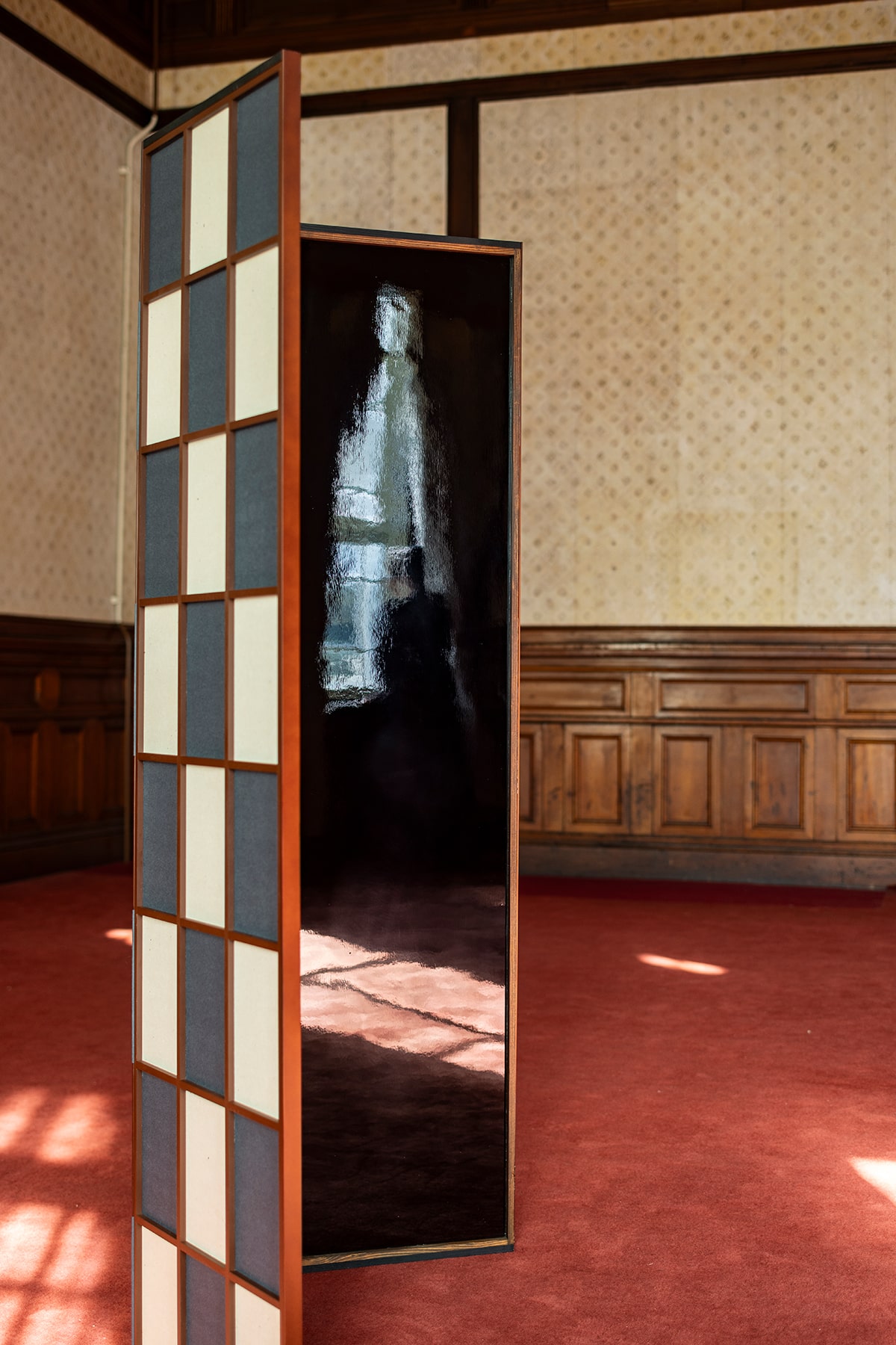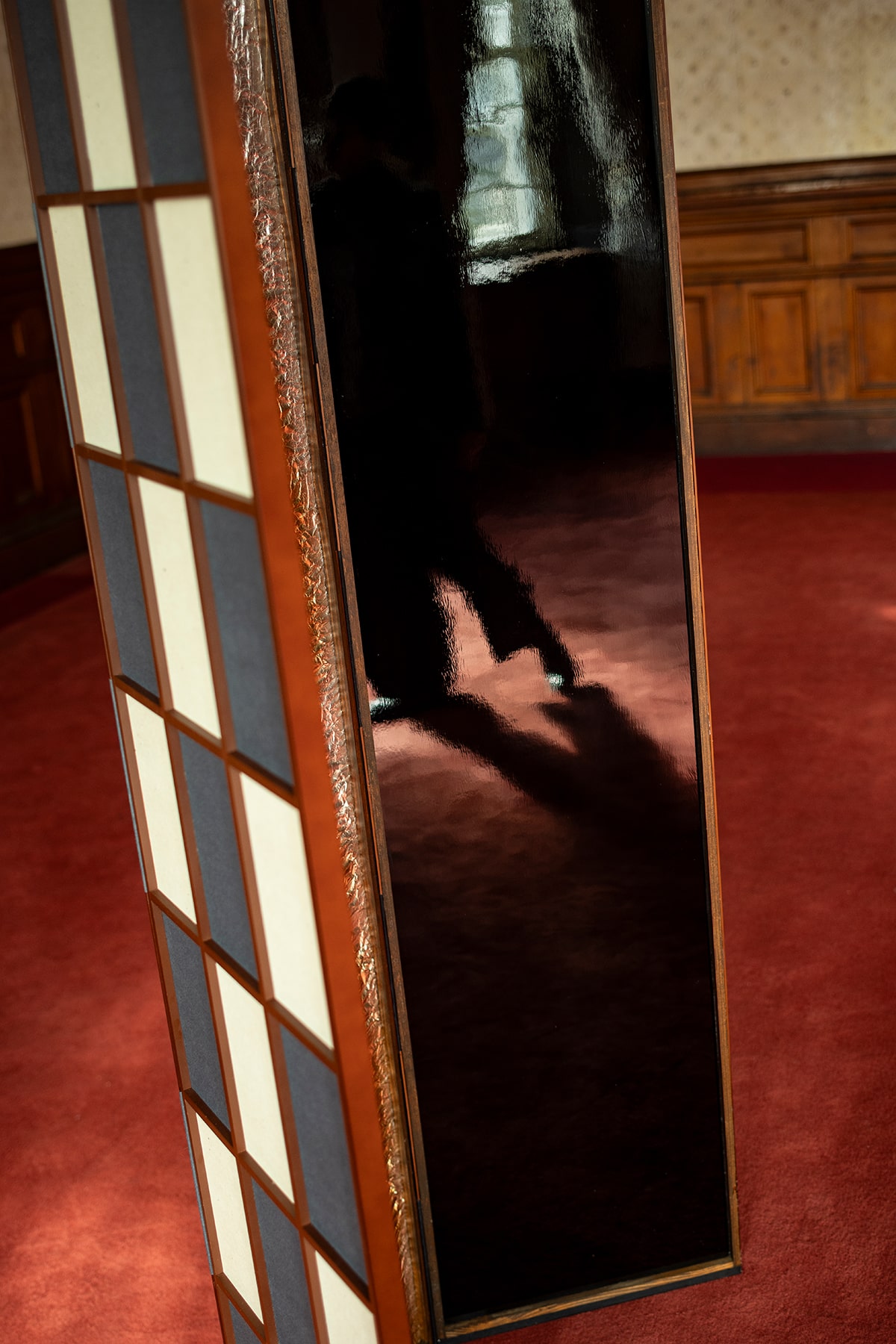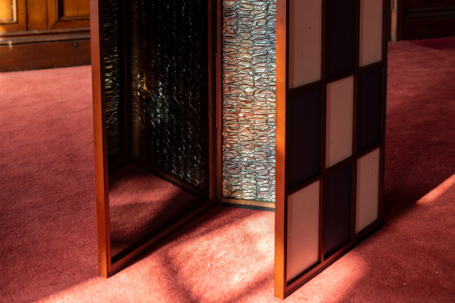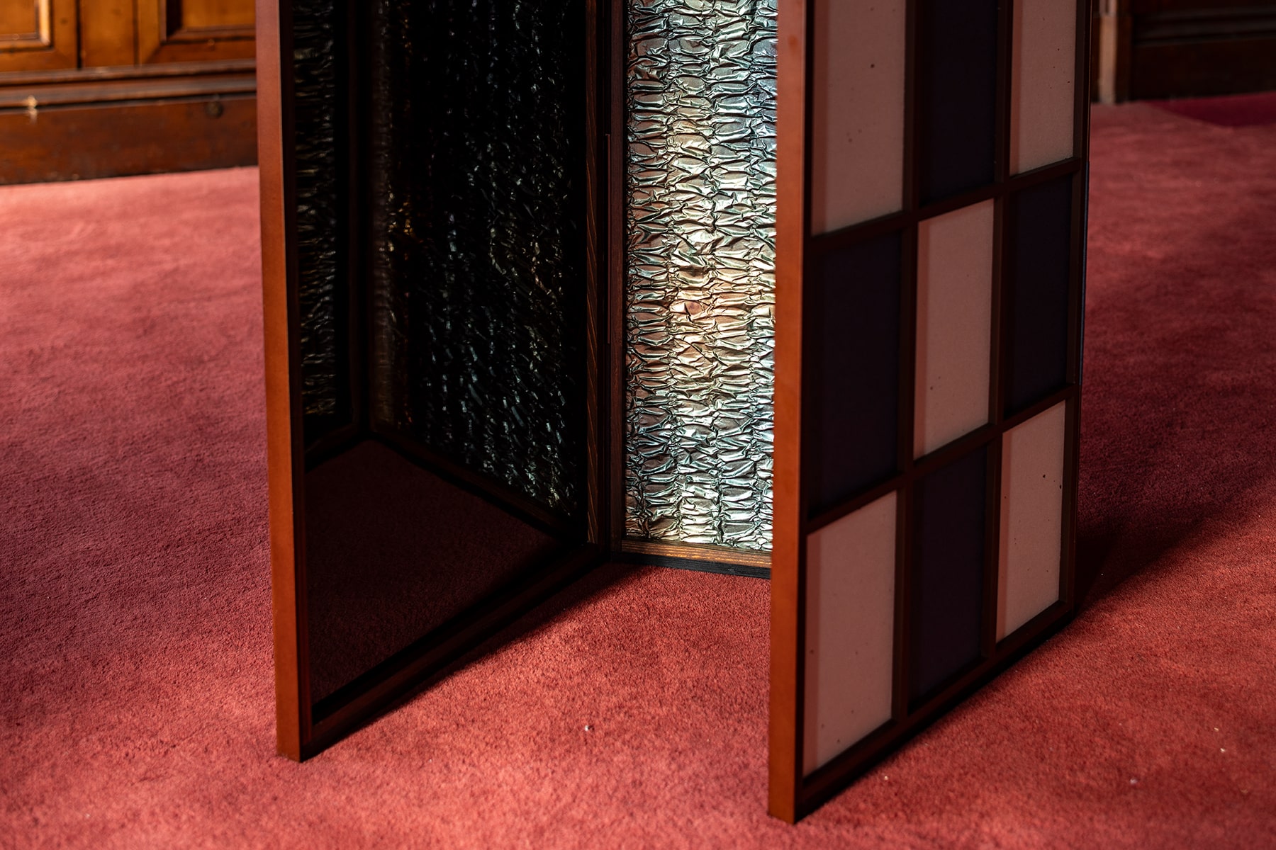 表具師 弘誠堂は、銀箔を一枚一枚丁寧に重ね、押し固めながら畳のような質感を生み出す。その上に、光と影が交差する新たな素材を生み出し、そこからは繊細な恥じらいが漂う。やがてその質感は見る者を親密な空間へと誘う。漆の表面に映る柔らかな光は、より深い結びつきの予感をほのめかす。