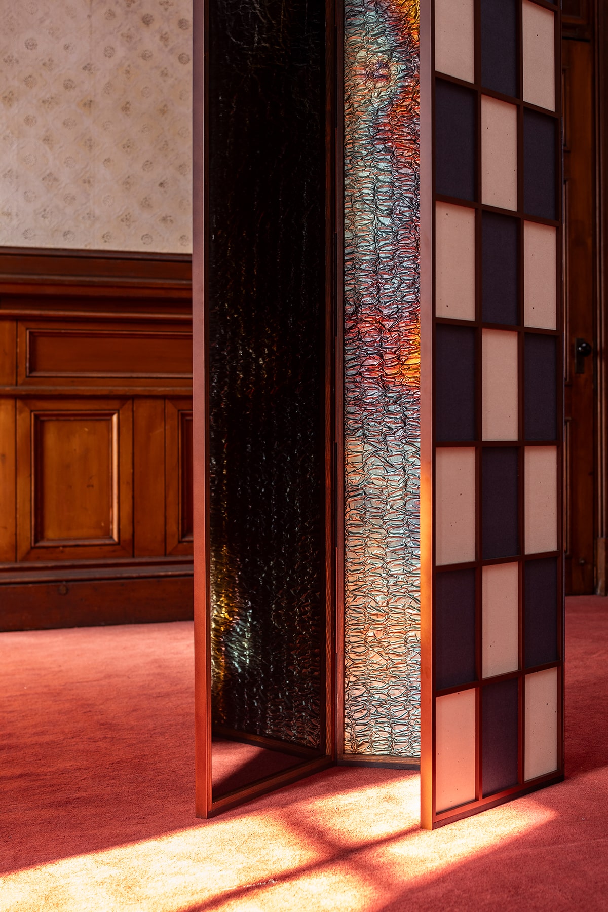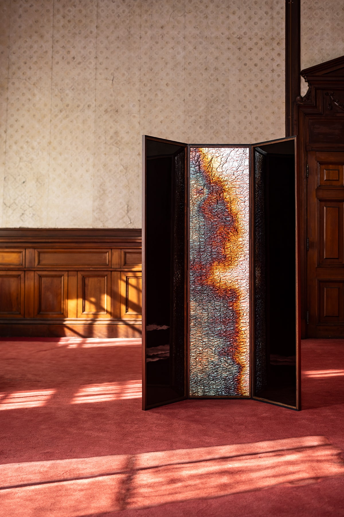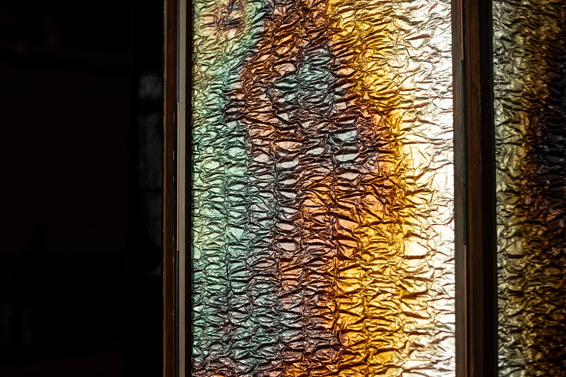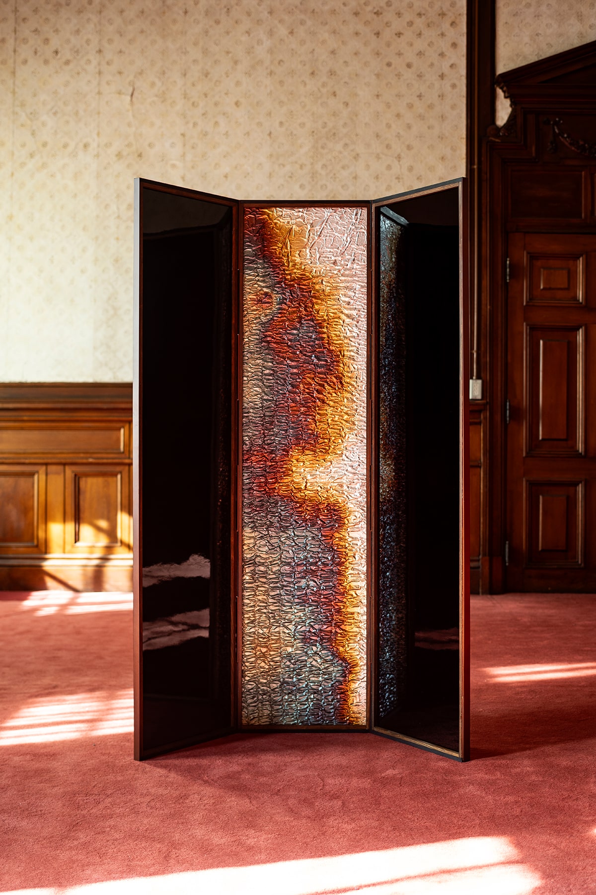 表具師 弘誠堂は、銀箔を一枚一枚丁寧に重ね、押し固めながら畳のような質感を生み出す。その上に、光と影が交差する新たな素材を生み出し、そこからは繊細な恥じらいが漂う。やがてその質感は見る者を親密な空間へと誘う。漆の表面に映る柔らかな光は、より深い結びつきの予感をほのめかす。