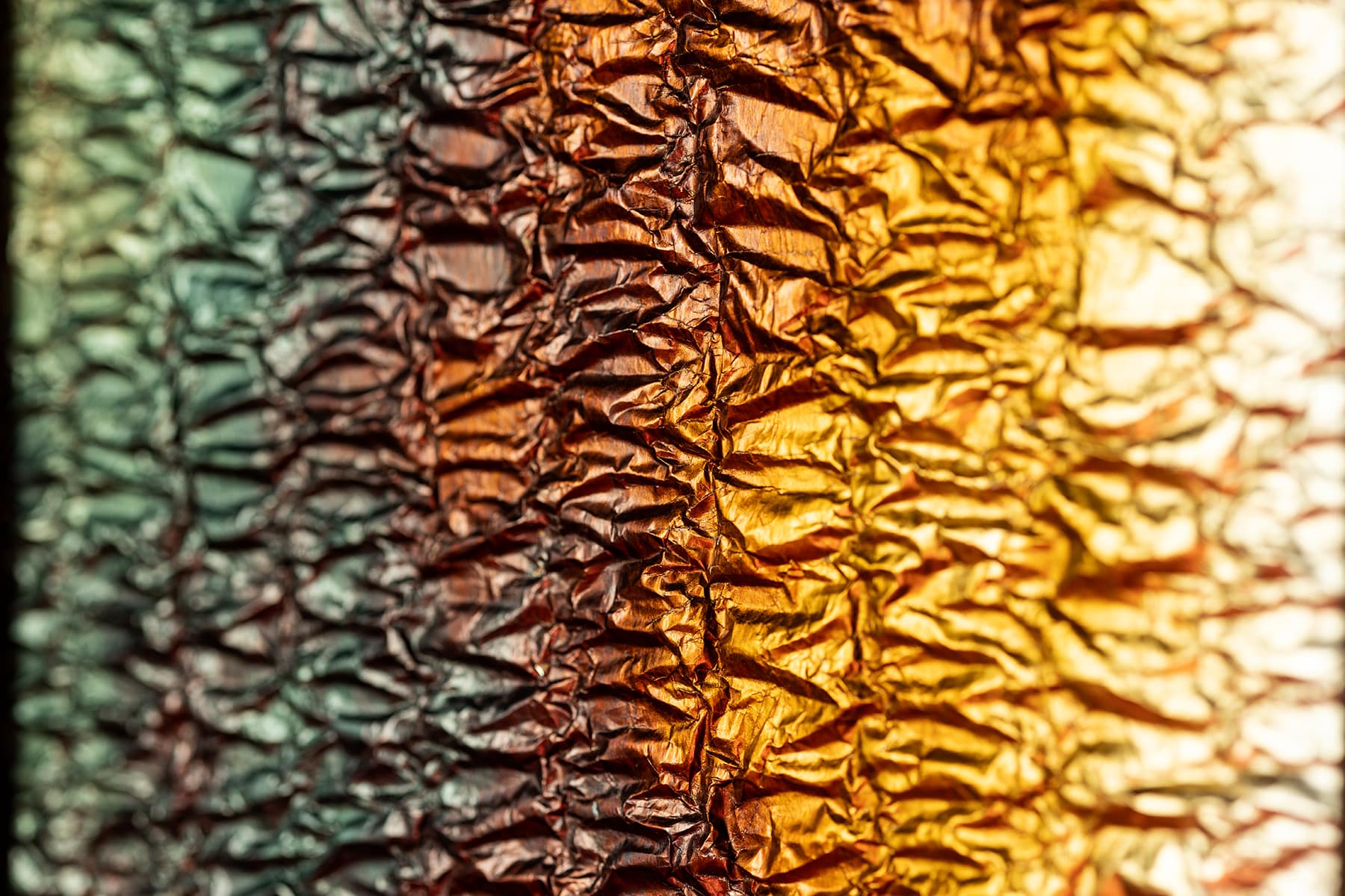 Paper cranes are made by folding square paper to resemble a crane, the symbol of peace. A kaleidoscopic art panel in which 100 folded paper cranes are shaped with silver foil paper, then each piece is treated according to a traditional process, in order to obtain a burnt appearance, unfolded and re-transformed into a piece of paper. The craftsman’s know-how dedicated to the conservation and restoration of works of art is used here to create an object of prayer for peace.