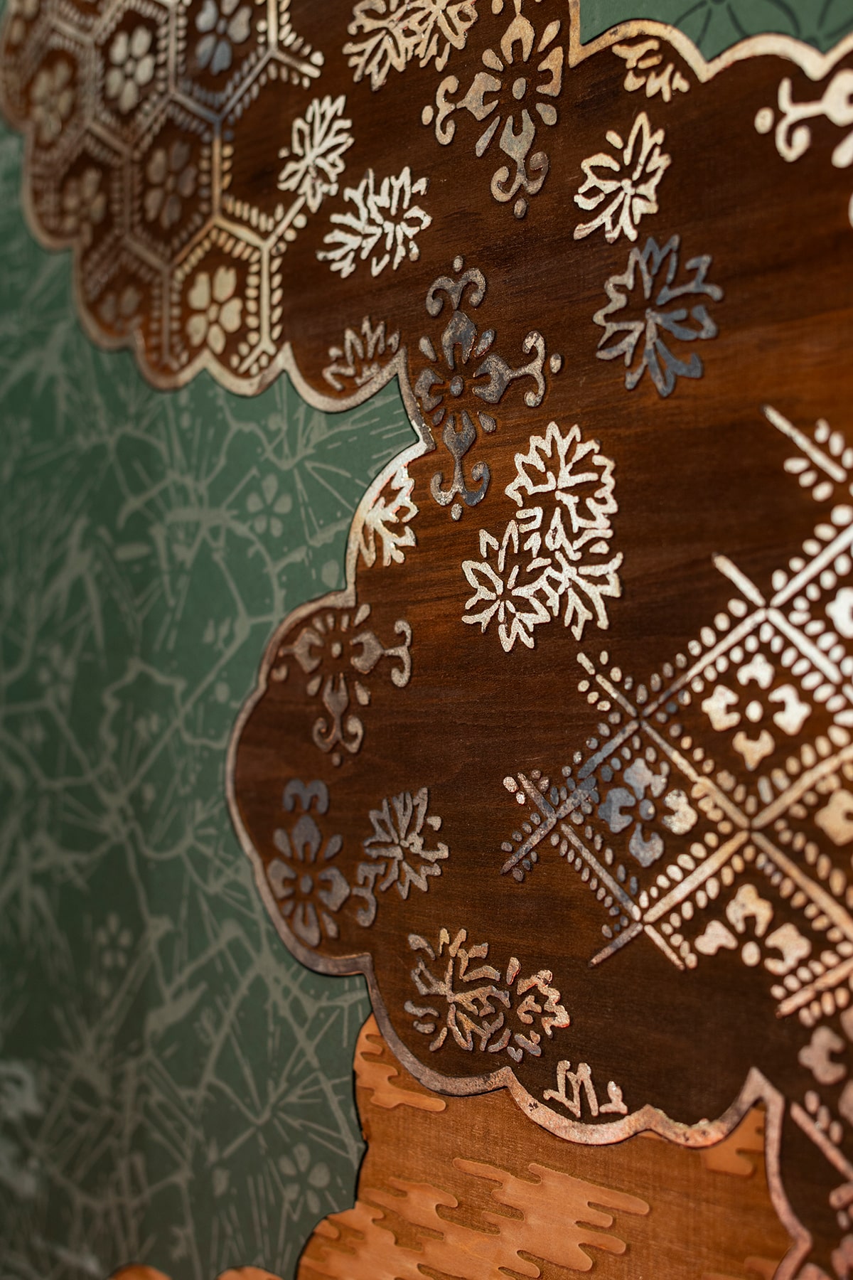草花や波などの自然をモチーフとした古来から伝わる伝統文様を彫刻した木版を、大小複数のパネル状にして集積。落着きのある木目の静と彫刻の躍動の対比が美しい表情を見せる。