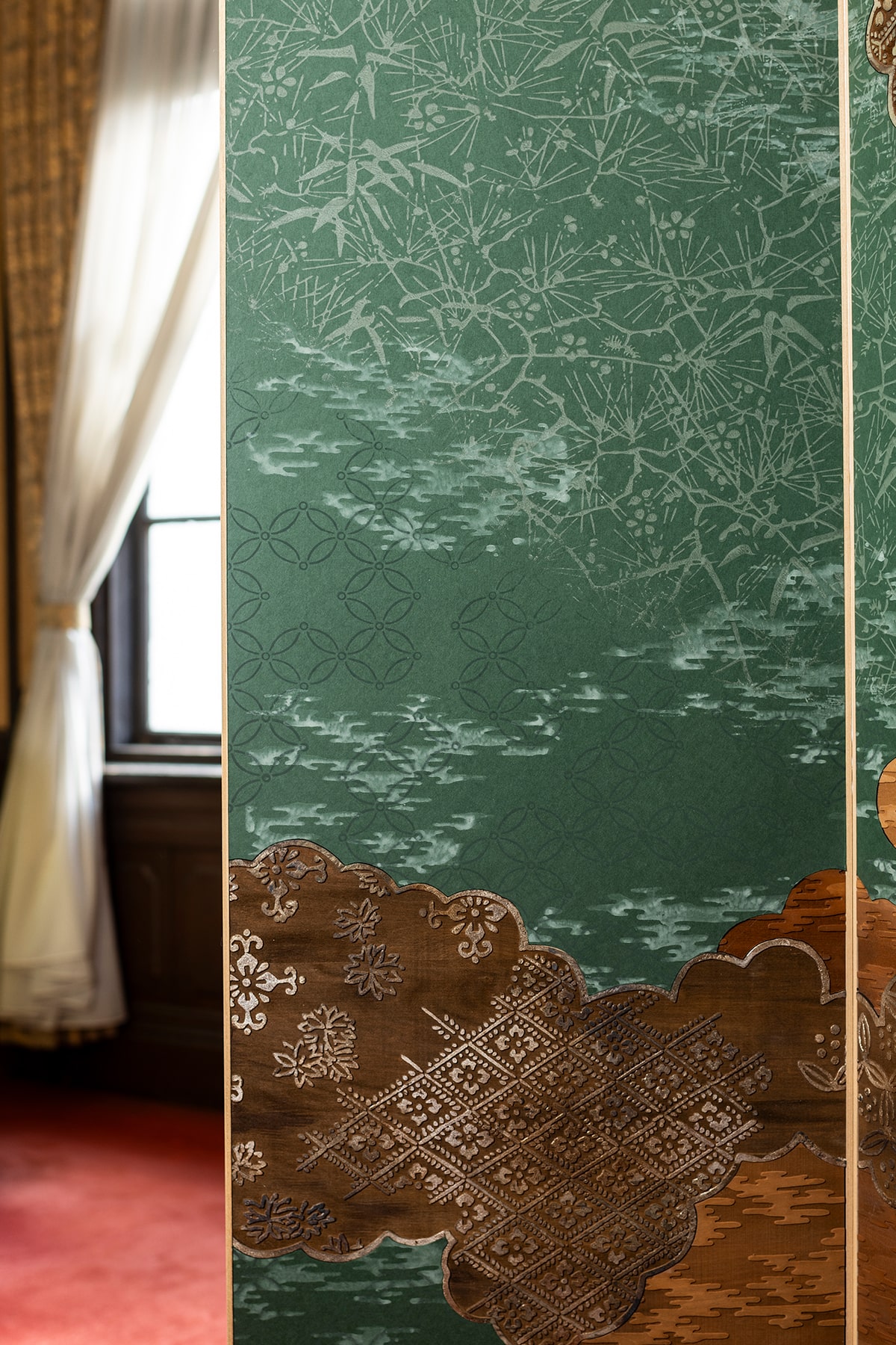 同社が江戸時代から受け継いできた伝統文様を用いながら再現した、琳派の世界。中央に配された版木には、夜の霧に包まれた松竹梅林を静かに流れる観世水の文様が彫られており、優美な空間を演出する。