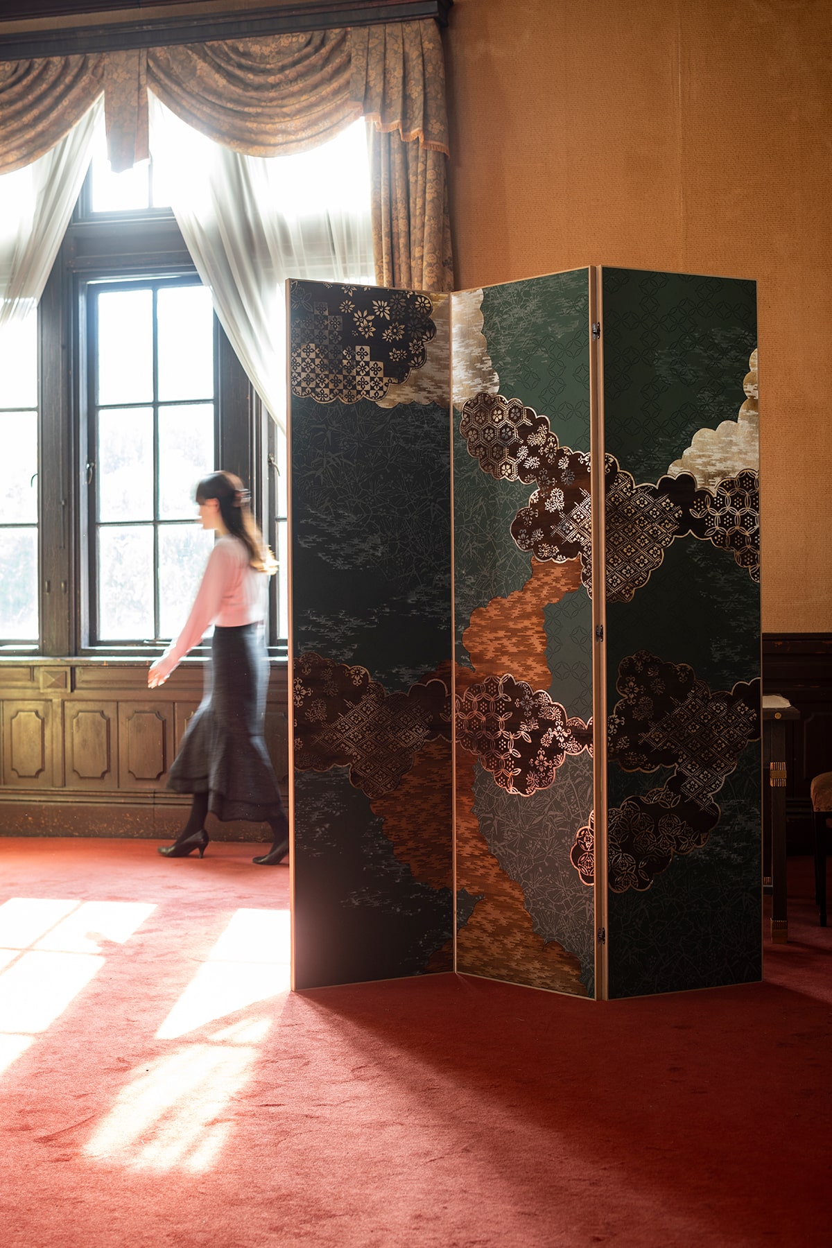 The traditional patterns are layered on both sides of the partition to portray light shining from behind clouds and mountains. Various techniques such as applying silver and gold to woodblocks and copying patterns on silver paper create an expressive artwork.