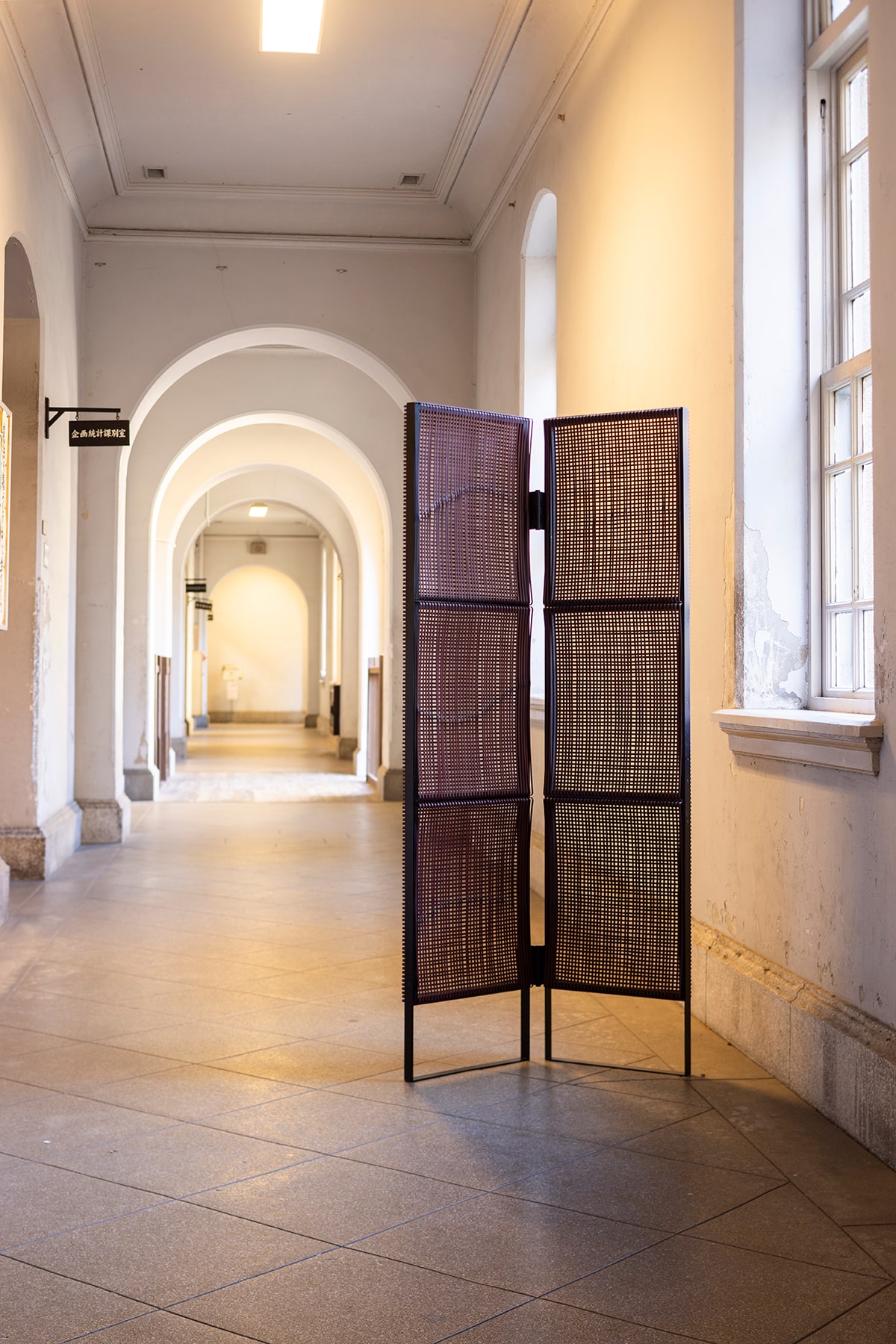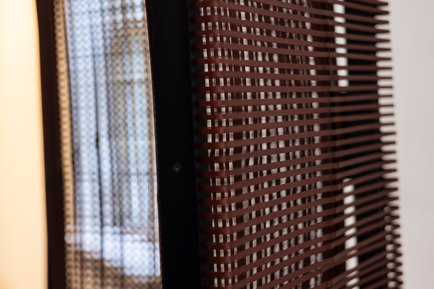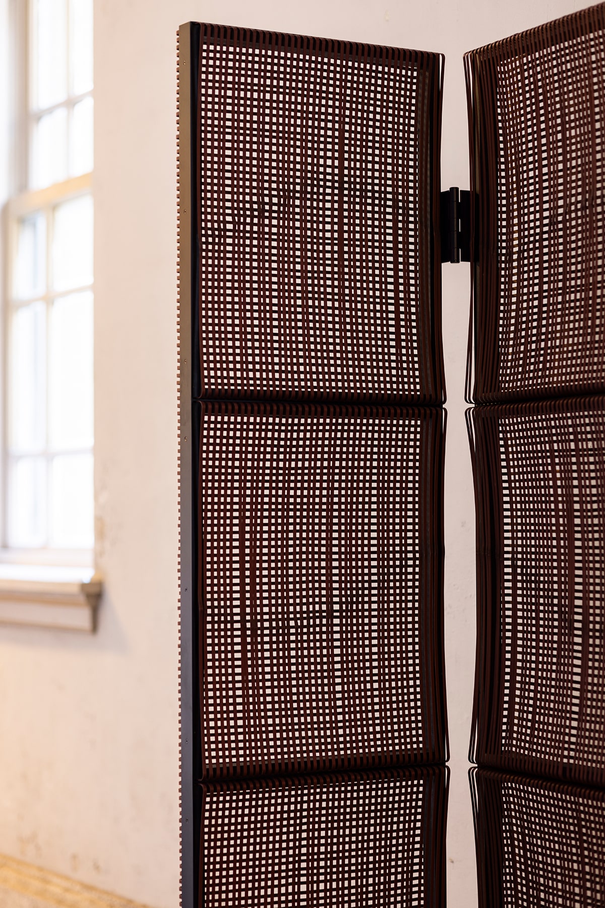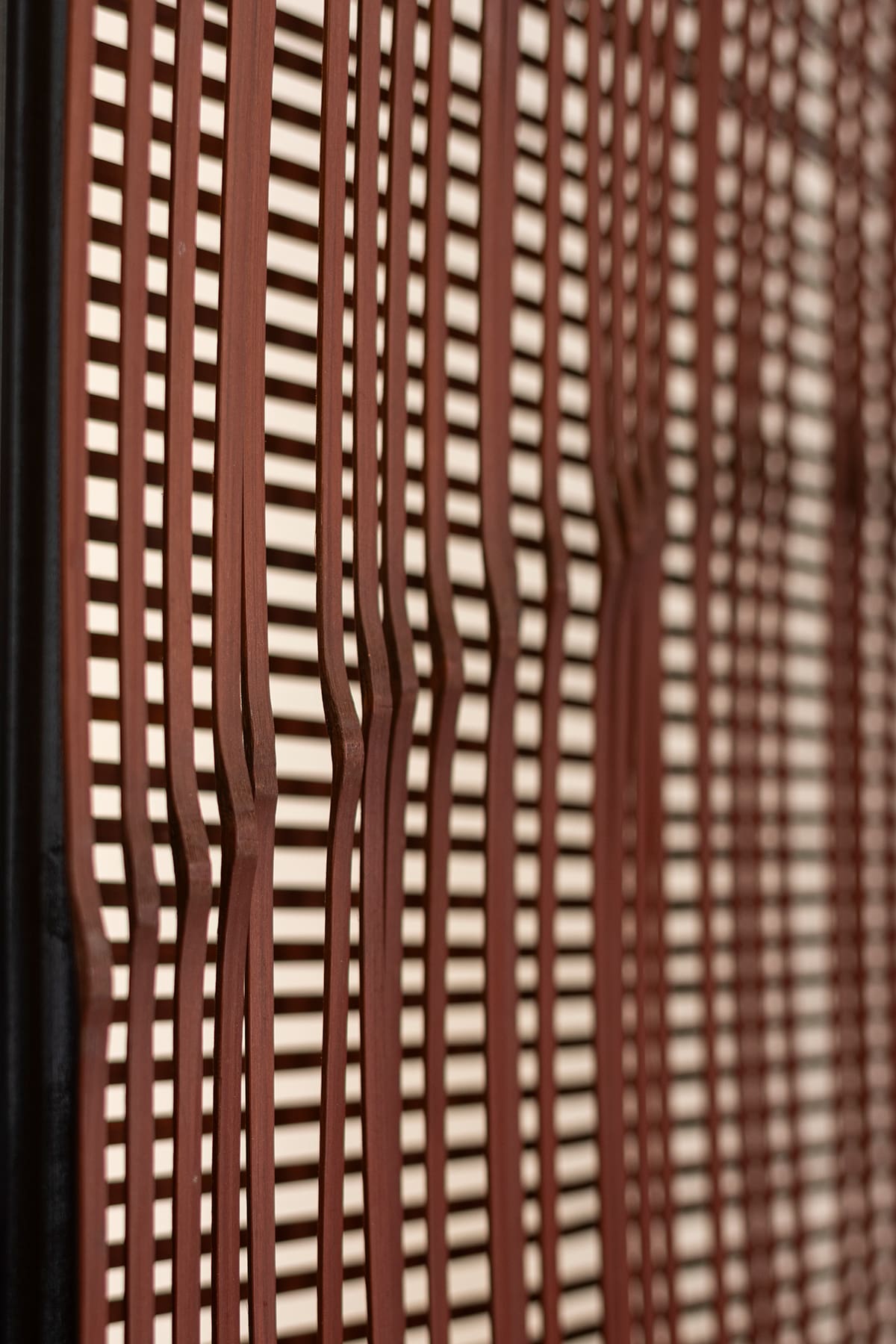 京銘竹のごま竹を、モジュールに積み上げた間仕切りパネルは自由に曲げる事が可能なミニマル作品。