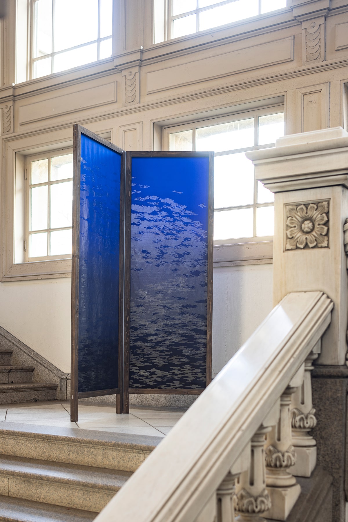 独自の技法「ふくれ織」により立体的に表現した枯山水庭園の砂紋。2021年度の新作は、淡い陽光から夕暮れの薄明かりまでという時間軸の要素をグラデーションで表現、時の移ろいを感じられる作品となっている。