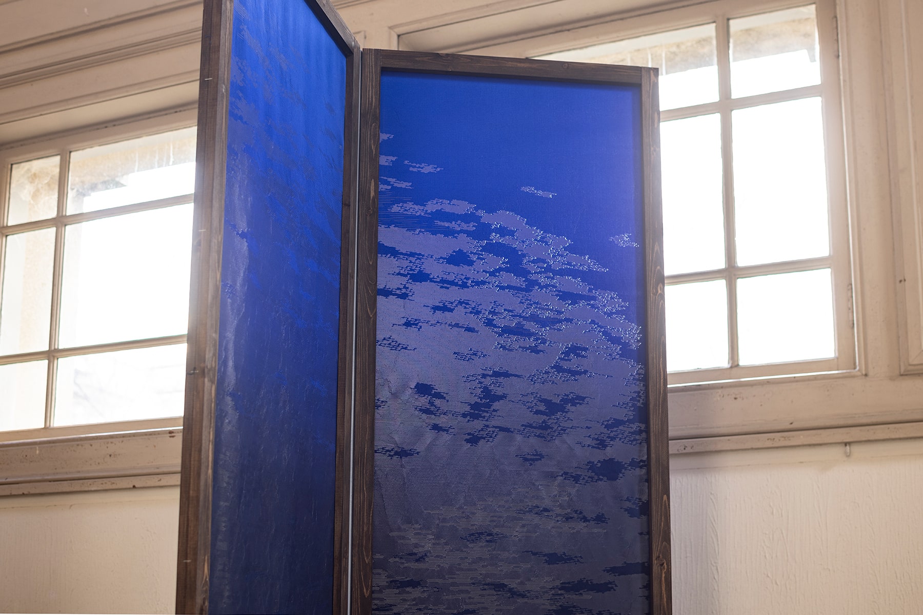 Textile Artpanel “cumulus”This piece uses Nishijin Fukura-ori weaving technique to depict the moment when clouds rise up with vigor.